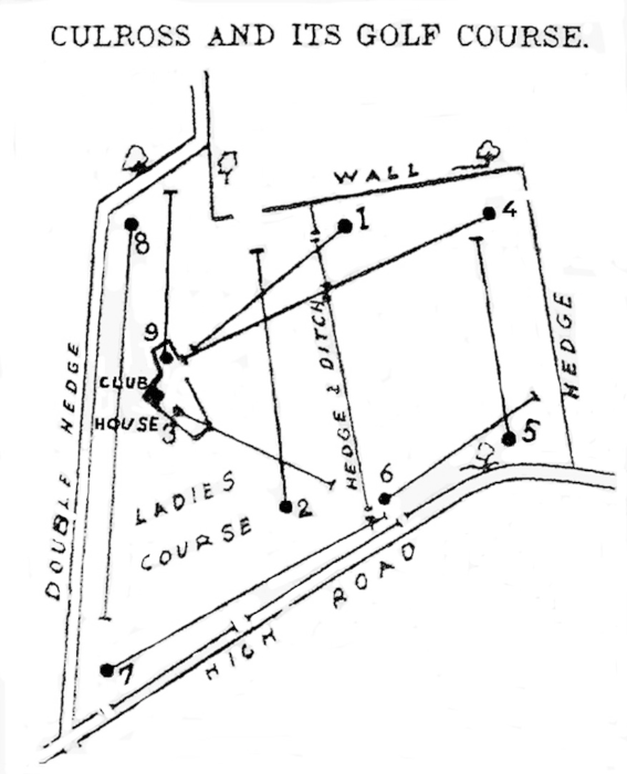 The course consists of two old pasture fields which have been secured from Mr Dalgleish on the estate of Braxton Grange. Like most inland courses, the one at Culross cannot compare with St Andrews Links, but it affords considerable scope for good play, natural hazards in the shape of high hedges, trees and ditches having been taken advantage of, and where long driving is not required the player will find some really good sporting holes. A Ladies course has likewise been provided, as may be seen from the accompanying sketch." (EED 21.5.1896)